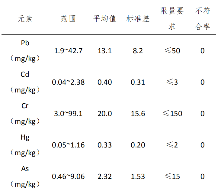 與我國現(xiàn)有的有機肥料農(nóng)業(yè)行業(yè)標準NY525-2012中對重金屬的限量指標 Pb(≤50mg/kg)、Cd(≤3mg/kg)、Cr(≤150mg/kg)、Hg(≤2mg/kg)、As(≤15mg/kg)相比, 在采集的50份有機肥樣品中,Pb、Cd、Cr、Hg、As均未超標。